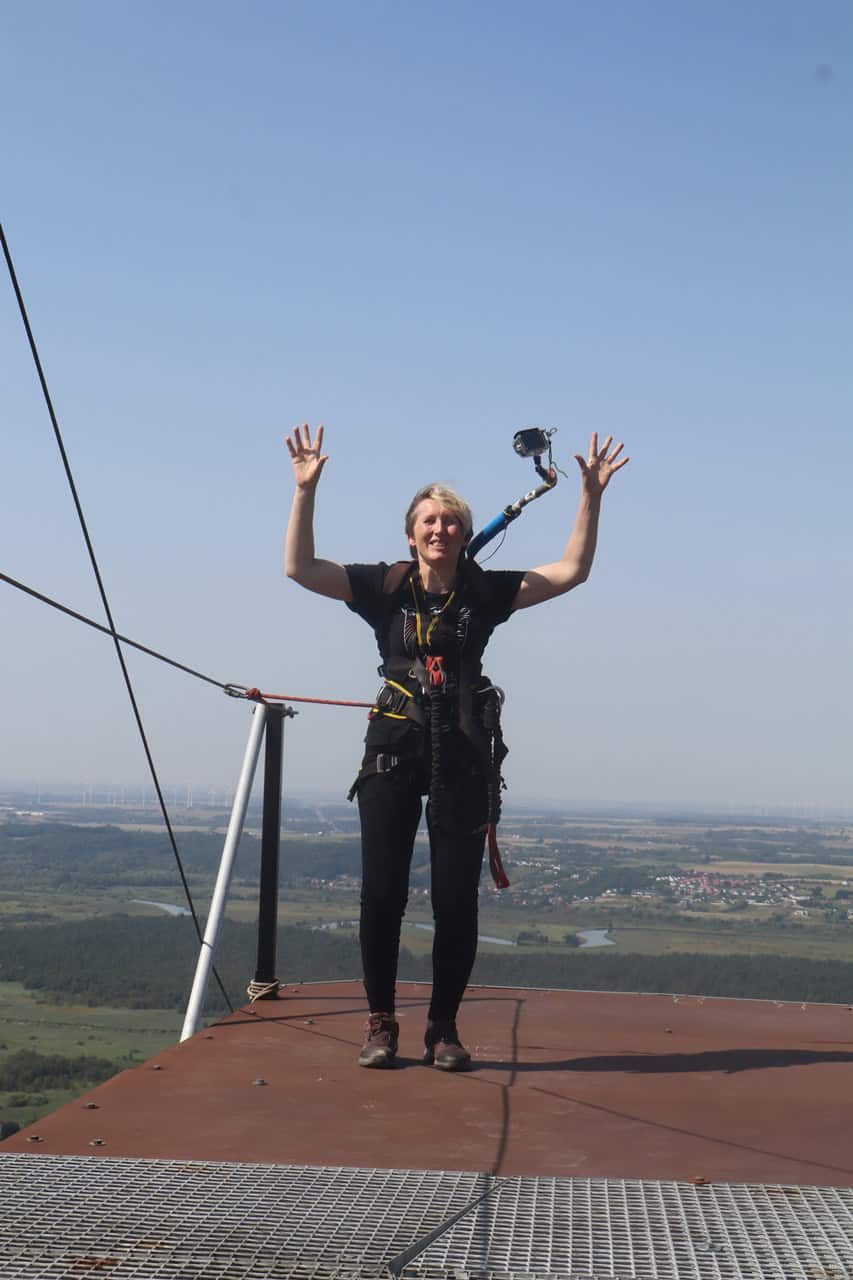 A. K.: Podczas pobytu w Szczecinie trafiliśmy na coś absolutnie niesamowitego: 252‑metrowy komin, z którego można skakać w systemie „dream jump”. To nie bungee – tu lecisz swobodnie, nic cię nie trzyma za nogi. Tutaj jesteś w pełnej uprzęży, takiej jak do wspinaczki. I kiedy wyskakujesz, masz poczucie absolutnie swobodnego lotu. Nic cię nie trzyma, nic nie ciągnie. Po prostu… lecisz.