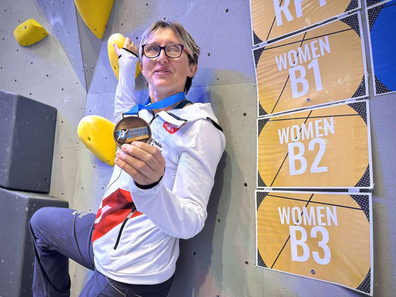 Agnieszka Kwolek na tle ścianki wspinaczkowej. Jedną ręką trzyma chwyty, drugą prezentuje zdobyty brązowy medal Pucharu Świata w Parawspinaczce w Laval (25–26.10.2025).