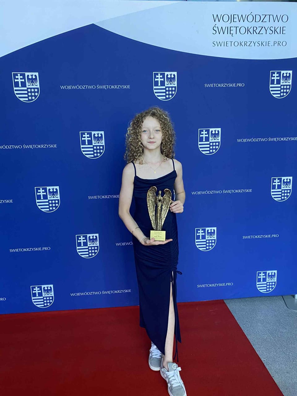 Na ciemnoniebieskim tle z powtarzającymi się cyklicznie białymi: herbem Województwa Świętokrzyskiego i napisem "Województwo Świętokrzyskie" stoi szczupła dziewczynka z kręconymi blond włosami do ramion w rękach trzyma statuetkę Świętokrzyski Anioł Dobroci w kolorze złotym