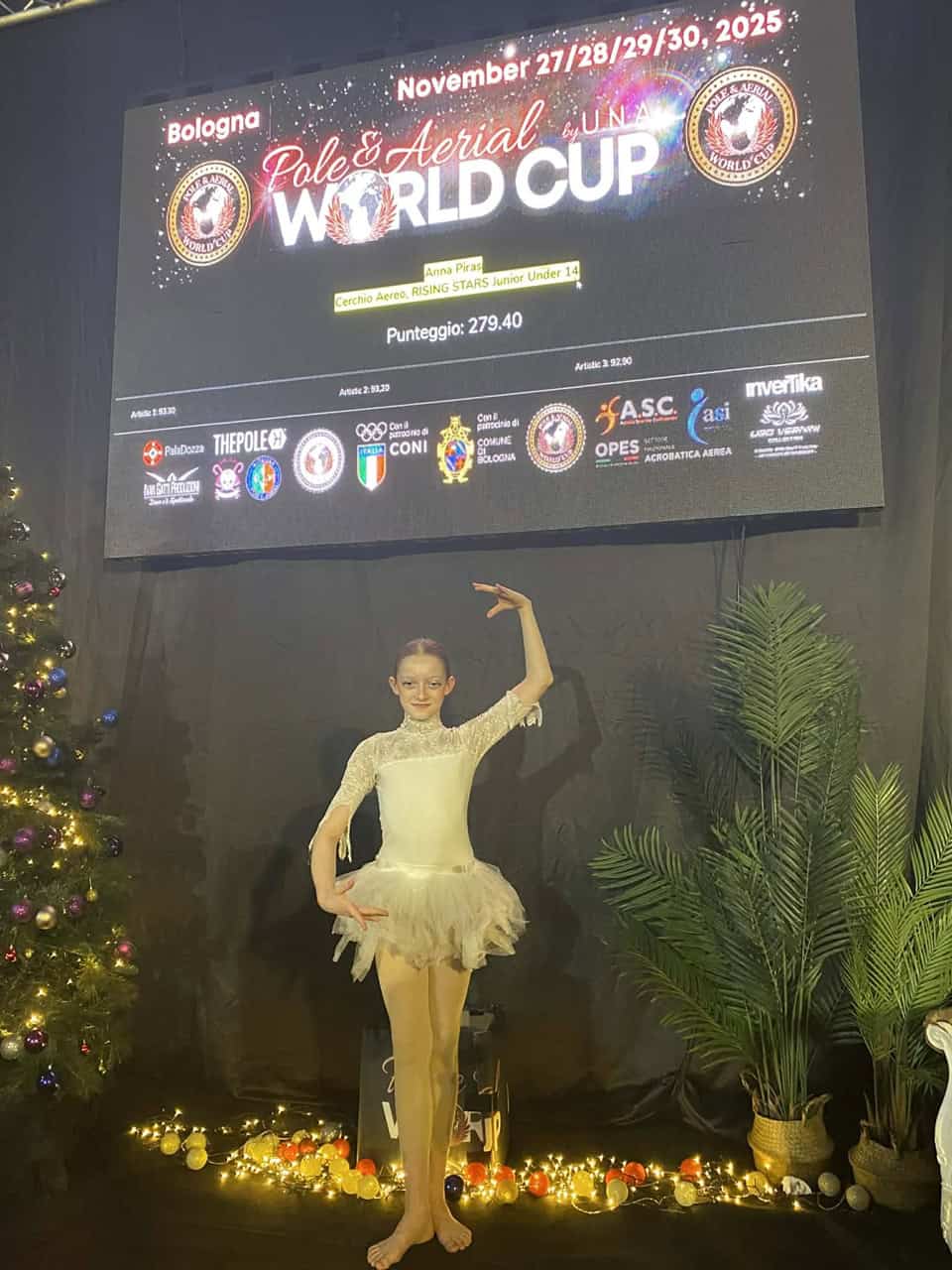 Kilka dni temu po raz drugi uczestniczyłam w pucharze świata „Pole and Aerial World Cup” w Bolonii. Wywalczyłam złoty medal w występie grupowym „Światełko pokoju” oraz zajęłam trzecie miejsce w konkurencji na kole cyrkowym w solowym występie z wynikiem punktowym 279 pkt. Aktualnie jestem na 11 miejscu w ogólnym rankingu na 295 osób. Jestem z tego powodu bardzo szczęśliwa.
