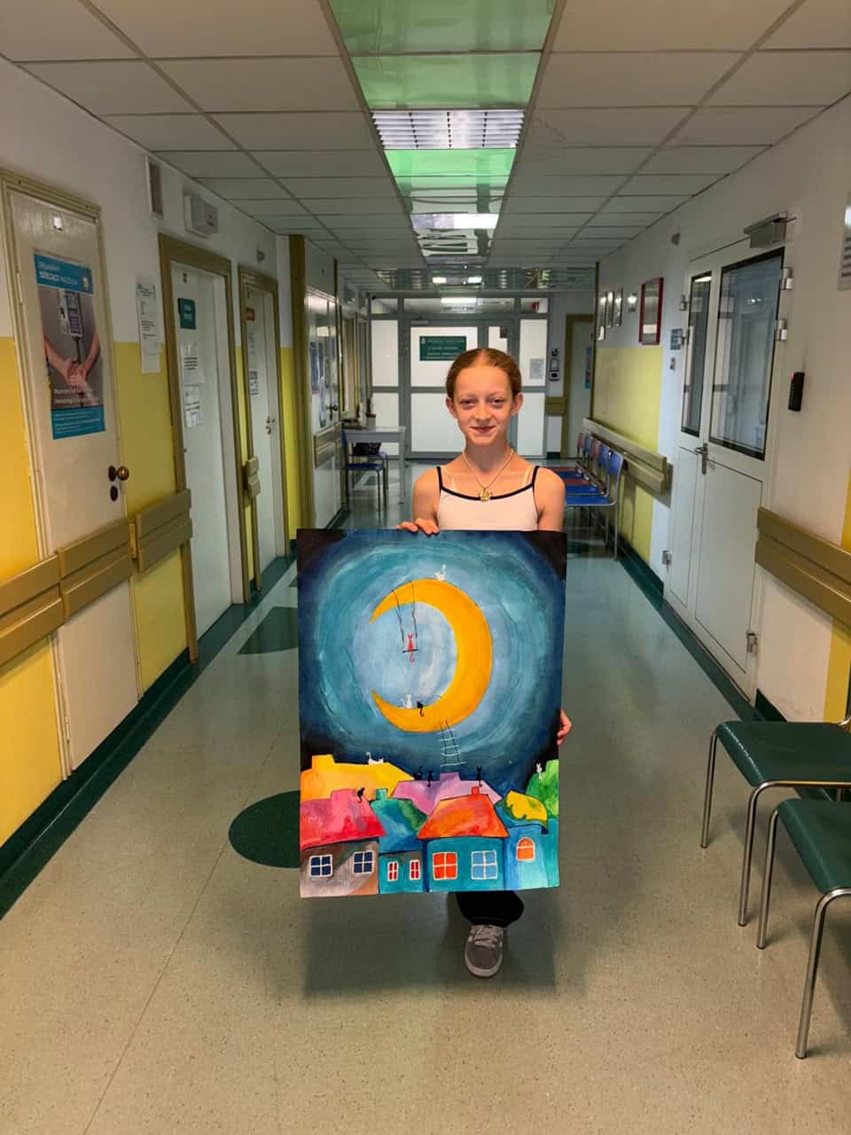 Gotowe obrazy przekazuję pani Małgosi Wiatr ze szpitala, która jest nauczycielką plastyki w przyszpitalnej szkole w Kielcach. Poznałam ją, kiedy sama trafiłam do szpitala. Dzięki niej mogłam uczestniczyć w programie „Słoneczna Galeria”, który powstał dla dzieci onkologicznych i hematologicznych. W czasie pandemii program połączono także z oddziałem diabetologicznym, więc mogłam z niego korzystać.