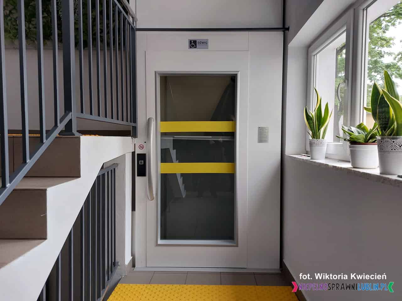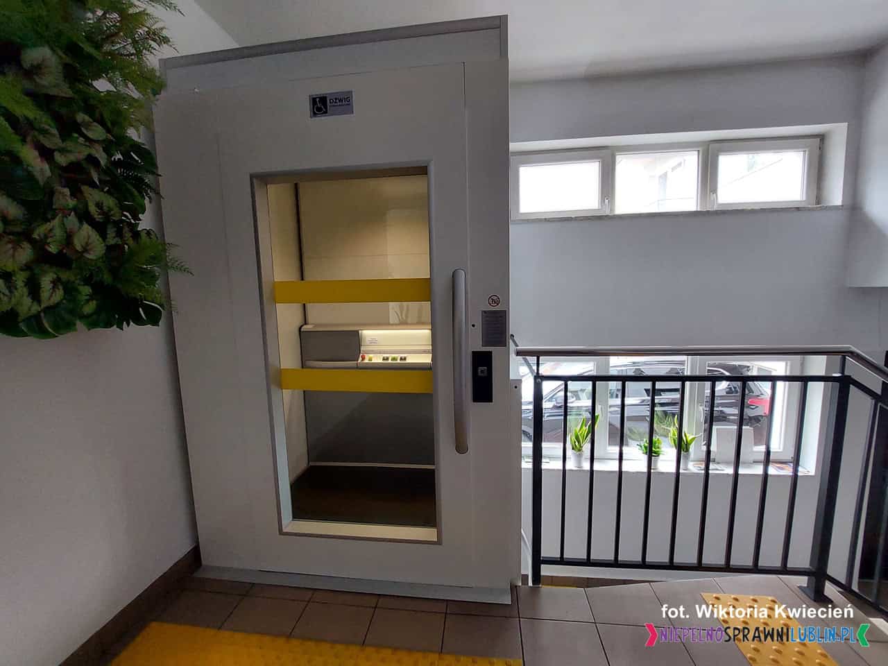 W ramach innych udogodnień mających na celu poprawę dostępności, zakupiono i zamontowano pionową platformę dla osób z niepełnosprawnościami, która umożliwia bezpieczne przemieszczanie się między poziomami w budynku parafialnym. Szklane i oznaczone kontrastowymi pasami w kolorze żółtym drzwi do windy znajdują się po prawej stronie od wejścia.