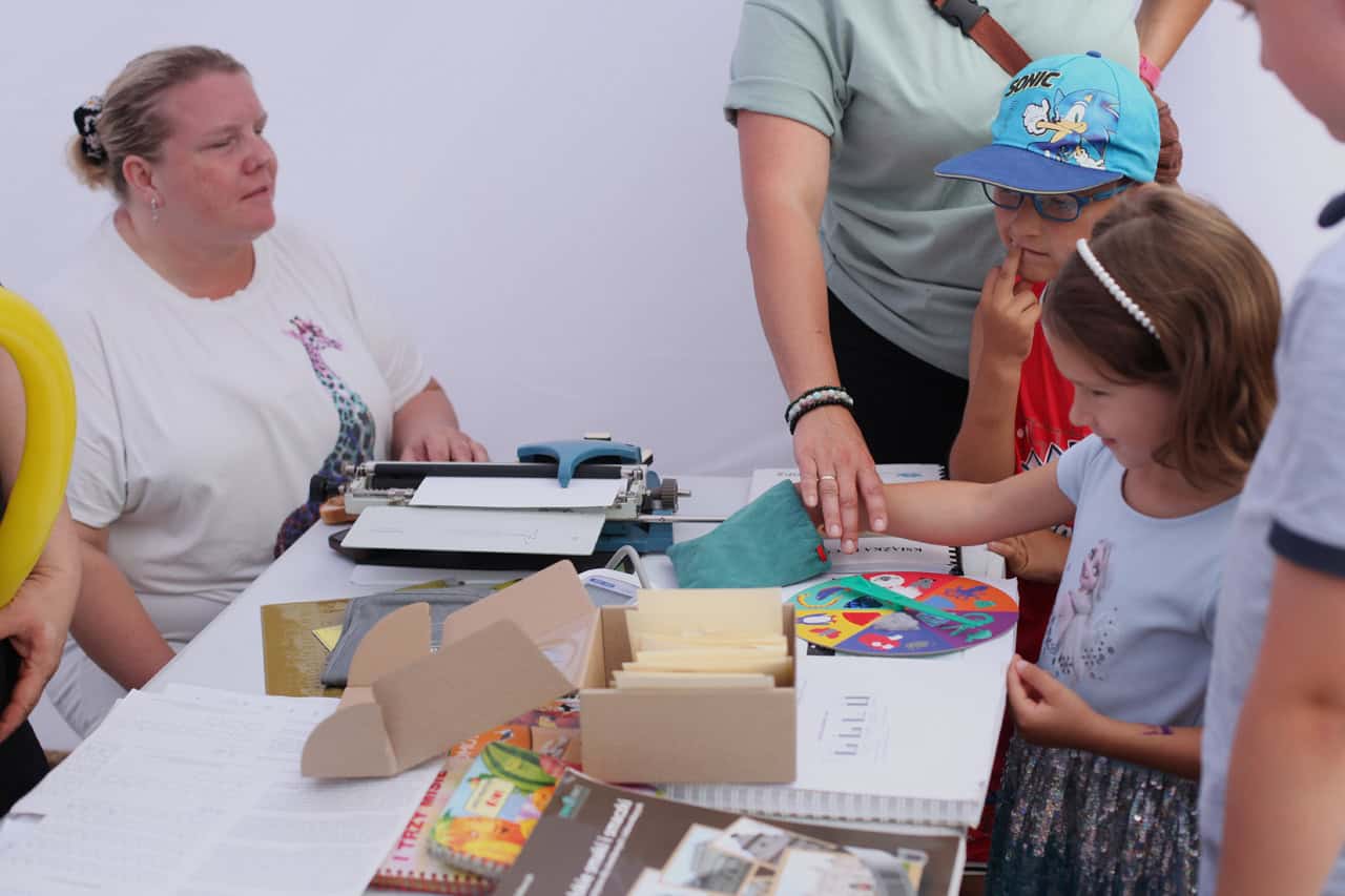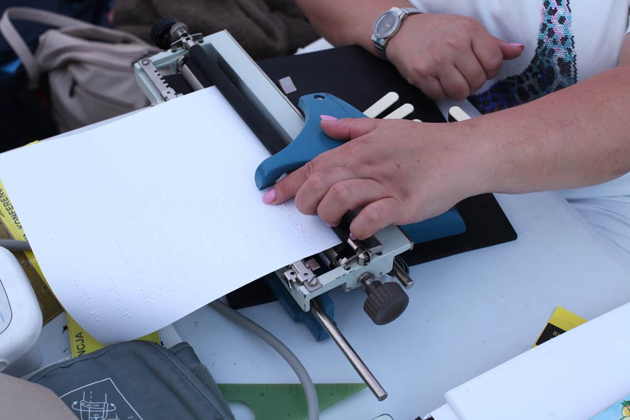 Jako fotoreporterka Lubelskiego Forum Organizacji Osób Niepełnosprawnych, z dumą obserwowałam zainteresowanie wokół naszego stoiska. Oprócz udzielania informacji, przygotowane były interaktywne atrakcje, w tym gra w rozpoznawanie kształtów dotykiem oraz pokaz działania brajlowskiej maszyny do pisania, prezentowany przez naszą koleżankę Ewelinę.