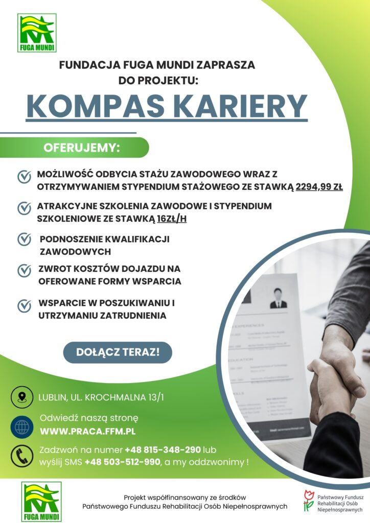 Fundacja Fuga Mundi zaprasza osoby z orzeczonym stopniem niepełnosprawności do uczestnictwa w projekcie "Kompas kariery", współfinansowanym ze środków Państwowego Funduszu Rehabilitacji Osób Niepełnosprawnych.