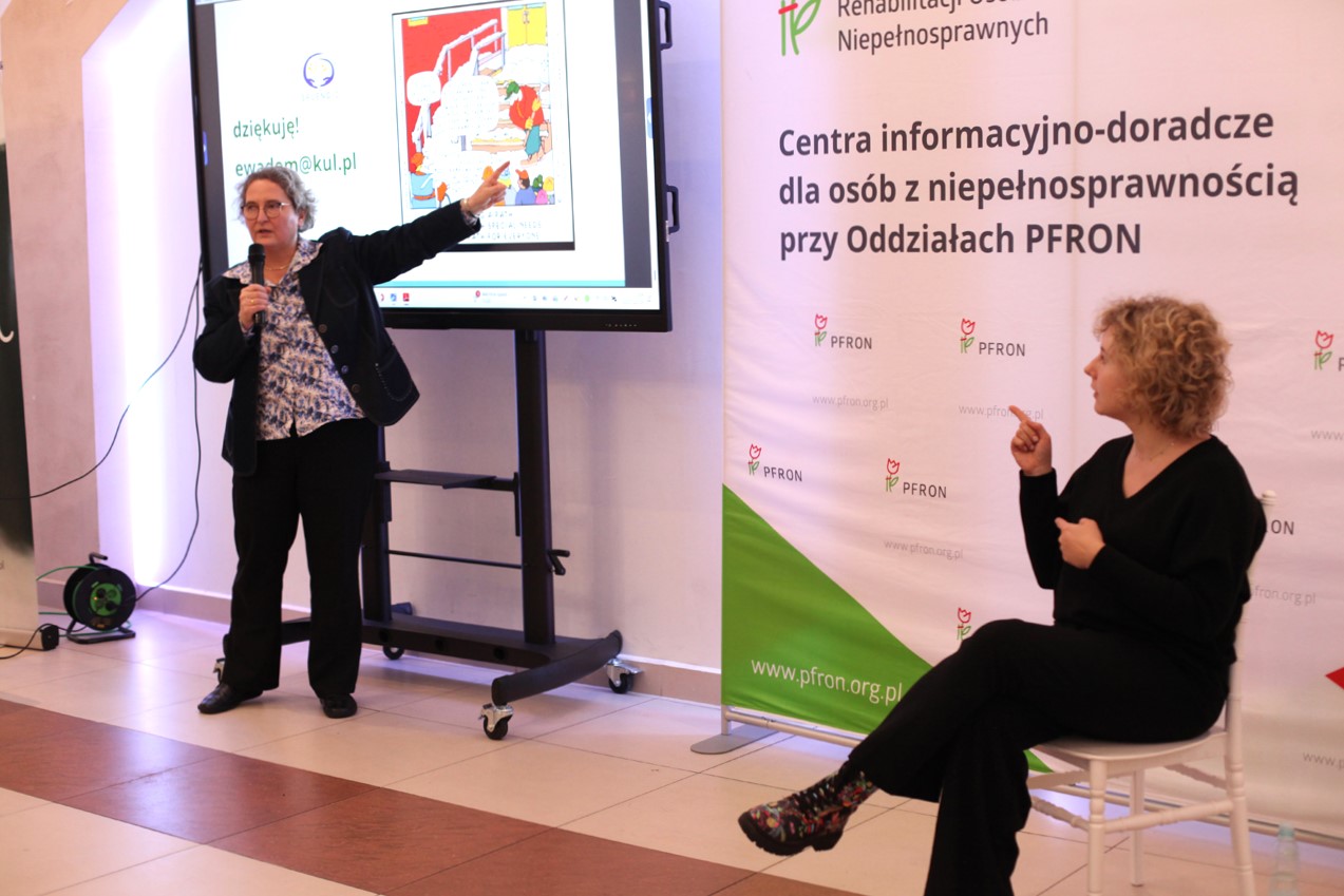 Następnie prof. KUL dr hab. Ewa Domagała-Zyśk, wprowadziła innowacyjne podejście w wykładzie „UDL – jak zmieniać przestrzeń publiczną i instytucje edukacyjne”. Prelegentka skupiła się na przełomowej koncepcji uniwersalnego projektowania dla nauki (UDL) jako metodzie systemowej eliminacji barier. Profesor z pasją wyjaśniła i zilustrowała to podejście, które sprowadza się do tworzenia rozwiązań wygodnych i wspierających jak największą liczbę osób. Podkreśliła, że uwzględnianie najszerszego spektrum potrzeb użytkowników – czyli myślenie o wszystkich – prowadzi do rozwiązań, które są korzystne nie tylko dla osób z niepełnosprawnościami, ale dla całej społeczności.