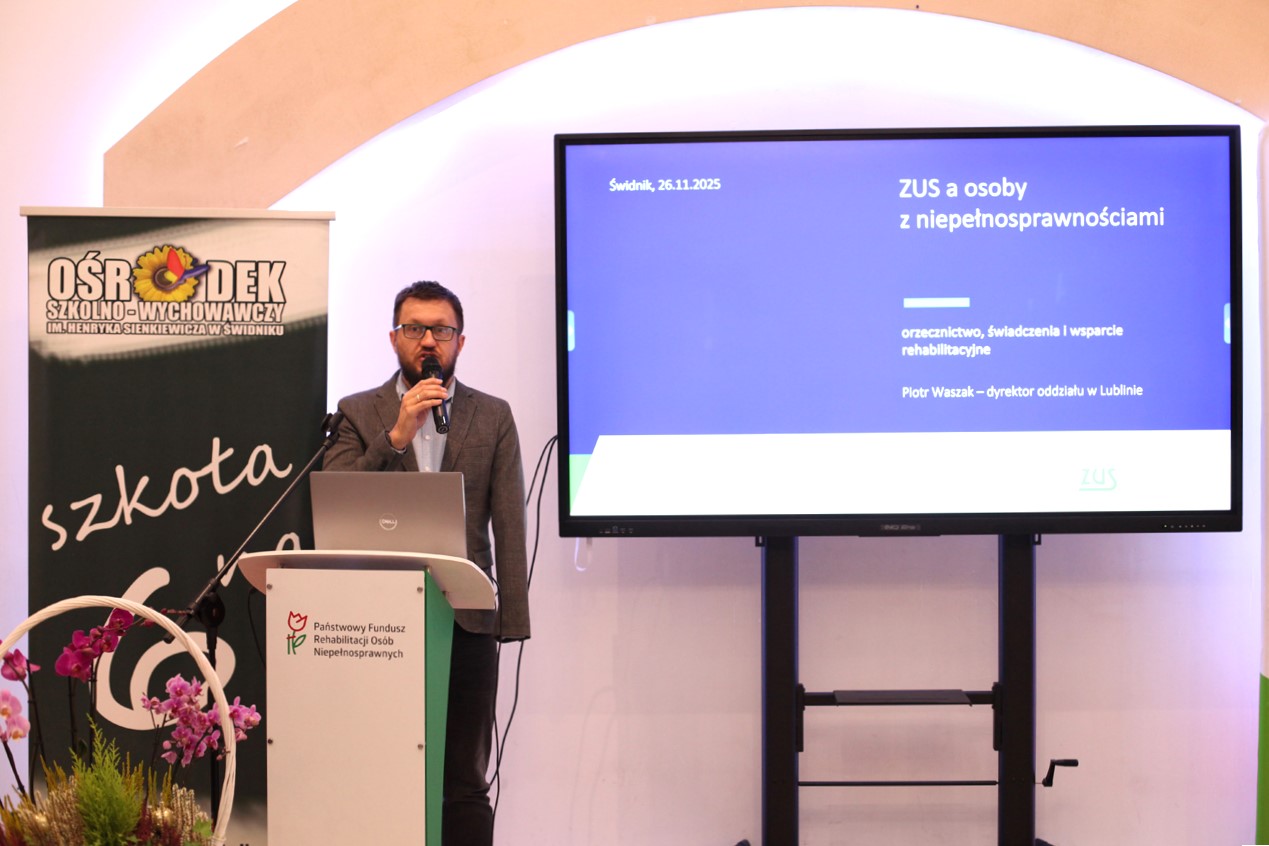 Ważny wkład w kwestię świadczeń wniósł Krzysztof Piskorz, Koordynator ds. komunikacji społecznej i edukacji w oddziałach ZUS (zastępując Dyrektora Piotra Waszaka), w wystąpieniu „ZUS a osoby z niepełnosprawnościami – orzecznictwo, świadczenia i wsparcie rehabilitacyjne”. Prelegent szczegółowo omówił rolę ZUS w kontekście wsparcia finansowego i zdrowotnego. Przedstawił kluczowe definicje, w tym definicję niezdolności do pracy zarobkowej, i wyjaśnił różnice między niezdolnością do pracy a orzeczeniem o niepełnosprawności. Omówił również proces orzecznictwa do celów rentowych, kluczowe świadczenia dla osób z niepełnosprawnościami obsługiwane przez ZUS oraz szczegóły dotyczące świadczeń uzupełniających, w tym dla osób niezdolnych do samodzielnej egzystencji.