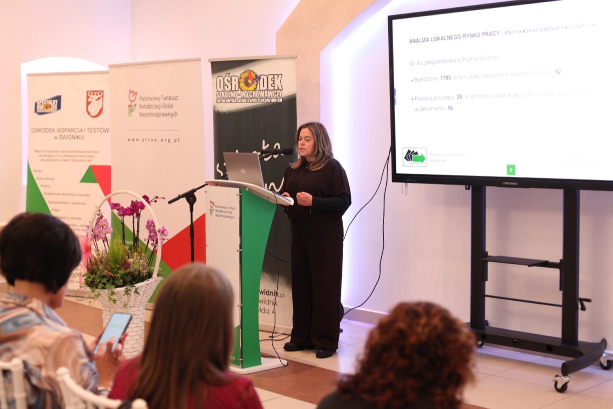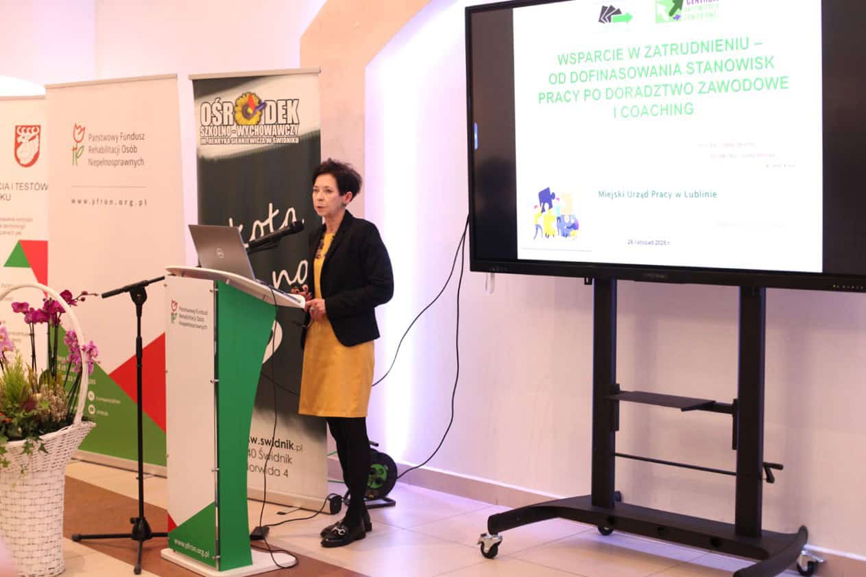 Blok poświęcony aktywizacji zawodowej kontynuowały Agata Wawruch i Agnieszka Rostek z Powiatowego Urzędu Pracy w Świdniku, prezentując „Wsparcie osób z niepełnosprawnościami w zakresie zatrudnienia i doradztwa zawodowego – realizowane przez Powiatowy Urząd Pracy w Świdniku”. Prelegentki rozpoczęły od analizy lokalnego rynku pracy ze stanem na koniec października 2025 roku, wprowadzając tym samym uczestników w realia zatrudnienia. Następnie szczegółowo omówiły formy pomocy oferowane przez PUP dla osób z niepełnosprawnościami, zarówno bezrobotnych, jak i poszukujących pracy, precyzyjnie wyjaśniając mechanizm efektywnego pośrednictwa pracy. Zaprezentowano barometr zarobków, ilustrujący deficyty w poszukujących pracy oraz omówiono poradnictwo zawodowe, prowadzone zarówno w formie indywidualnej, jak i grupowej, w tym stosowane testy do badania kompetencji i zainteresowań.