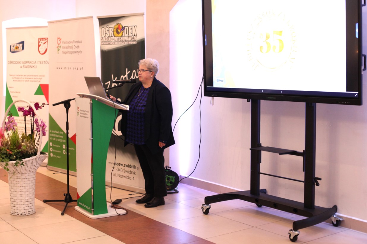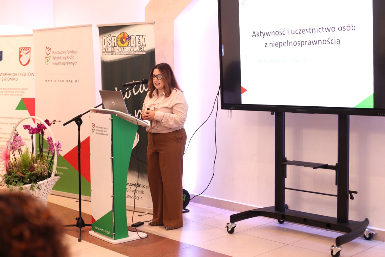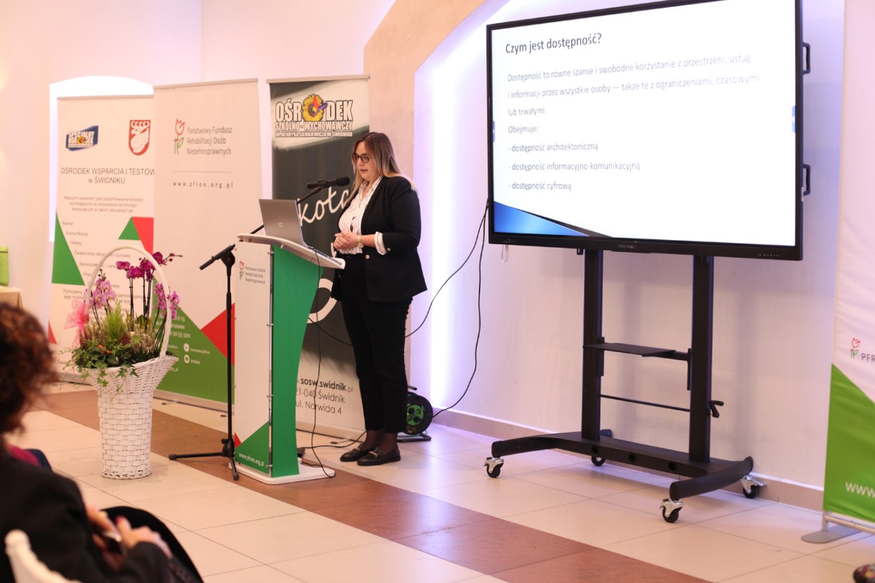 Kolejno, Ewelina Podkowa, referent Powiatowego Centrum Pomocy Rodzinie w Świdniku, w prelekcji „Dostępność jako wspólna odpowiedzialność – rola PCPR w budowaniu dostępnego powiatu” przedstawiła misję i cel PCPR. W jej wystąpieniu szczególnie silnie wybrzmiały konkretne dane dotyczące wsparcia w 2025 roku. W zakresie realizacji zakupu sprzętu rehabilitacyjnego, przedmiotów ortopedycznych i środków pomocniczych wypłacono dofinansowanie do 483 wniosków. Likwidacja barier (architektonicznych i komunikacyjnych): podpisano 30 umów. Turnusy rehabilitacyjne: na dofinansowanie przeznaczono 400 000 zł, które przyznano 274 osobom i ich rodzinom, co oznaczało wyczerpanie limitu środków na ten cel.