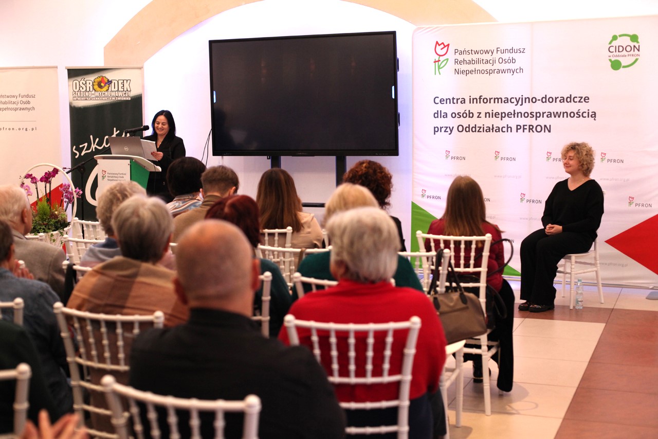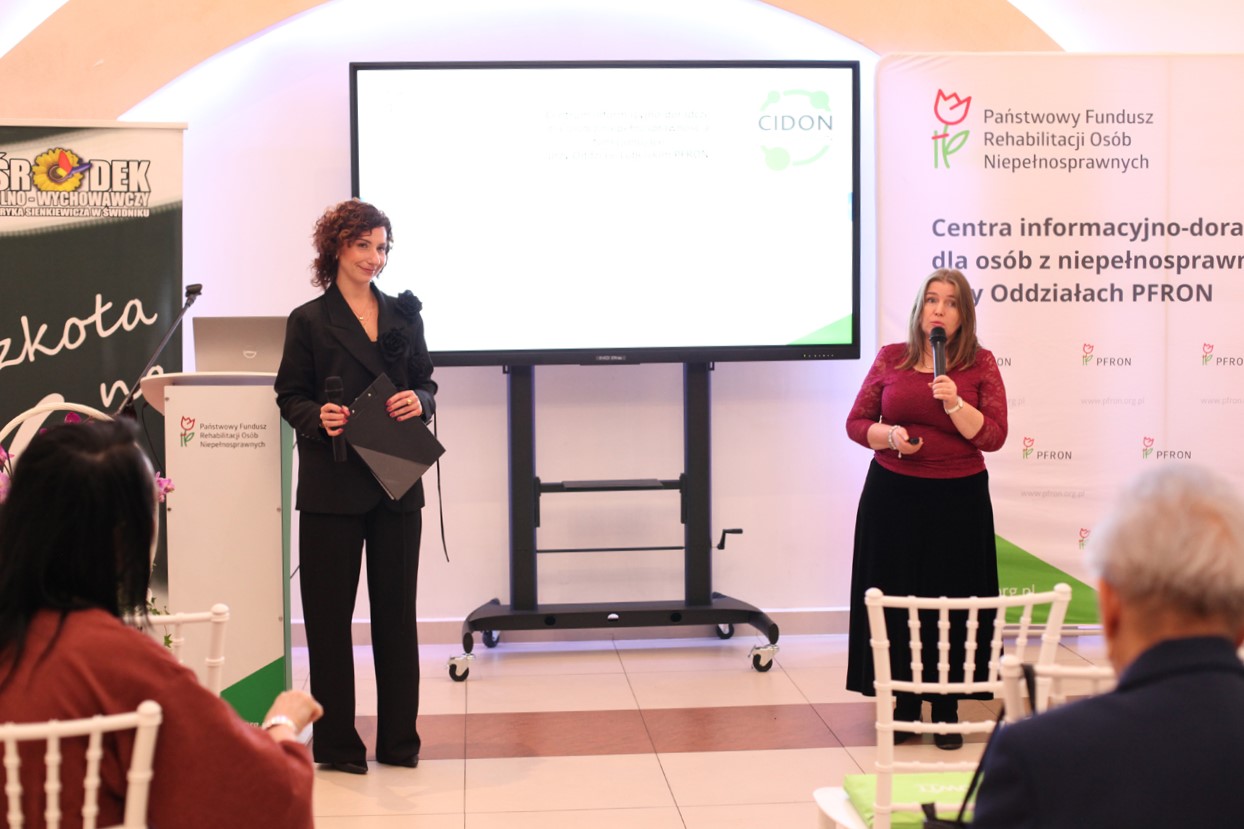 Aktualne możliwości dofinansowania zostały szczegółowo omówione przez Barbarę Sadowską-Burlitę, ekspert ds. CIDON i Iwonę Nowak-Podkowę, specjalistę ds. CIDON. w prelekcji „Rola PFRON w systemie wsparcia osób z niepełnosprawnościami – aktualne programy i możliwości dofinansowania”. Panie omówiły system obsługi wsparcia finansowego, koncentrując się na najczęściej popełnianych błędach we wnioskach składanych przez beneficjentów. Omówiono korzyści wynikające z zatrudniania osób z niepełnosprawnościami oraz szczegółowo zaprezentowano zasady dofinansowania do wynagrodzeń. Wspomniano też o możliwości wypożyczenia technologii wspomagających dla osób z niepełnosprawnościami.
