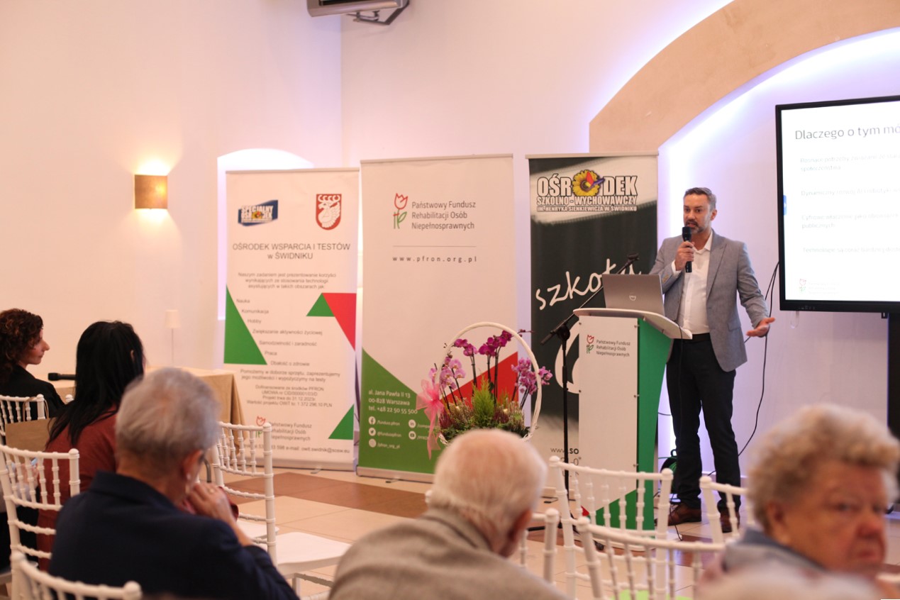 Finałowe wystąpienie, które wprowadziło uczestników w świat innowacji, należało do Daniela Wysmulskiego, kierownika merytorycznego OWiT Świdnik, który przedstawił temat „Nowoczesne technologie asystujące – jak AI, robotyka i cyfrowe rozwiązania wspierają osoby z niepełnosprawnościami”. Prelegent zaprezentował fascynującą panoramę nowoczesnych technologii – od AI, przez robotykę, po cyfrowe rozwiązania – stosowanych w edukacji, pracy i domach osób z niepełnosprawnościami. Omówił innowacyjne aplikacje wspierające pamięć, orientację i umożliwiające pracę zdalną, akcentując przełomową rolę sztucznej inteligencji (AI) i robotyki jako funkcjonalnego wsparcia, w tym technologii wsparcia zmysłów. Najważniejsze przesłanie było jednak etyczne: Wysmulski mocno podkreślił, że „Człowiek i jego potrzeby są zawsze na pierwszym miejscu”, a technologia ma pełnić wyłącznie rolę efektywnego i bezpiecznego narzędzia wsparcia.