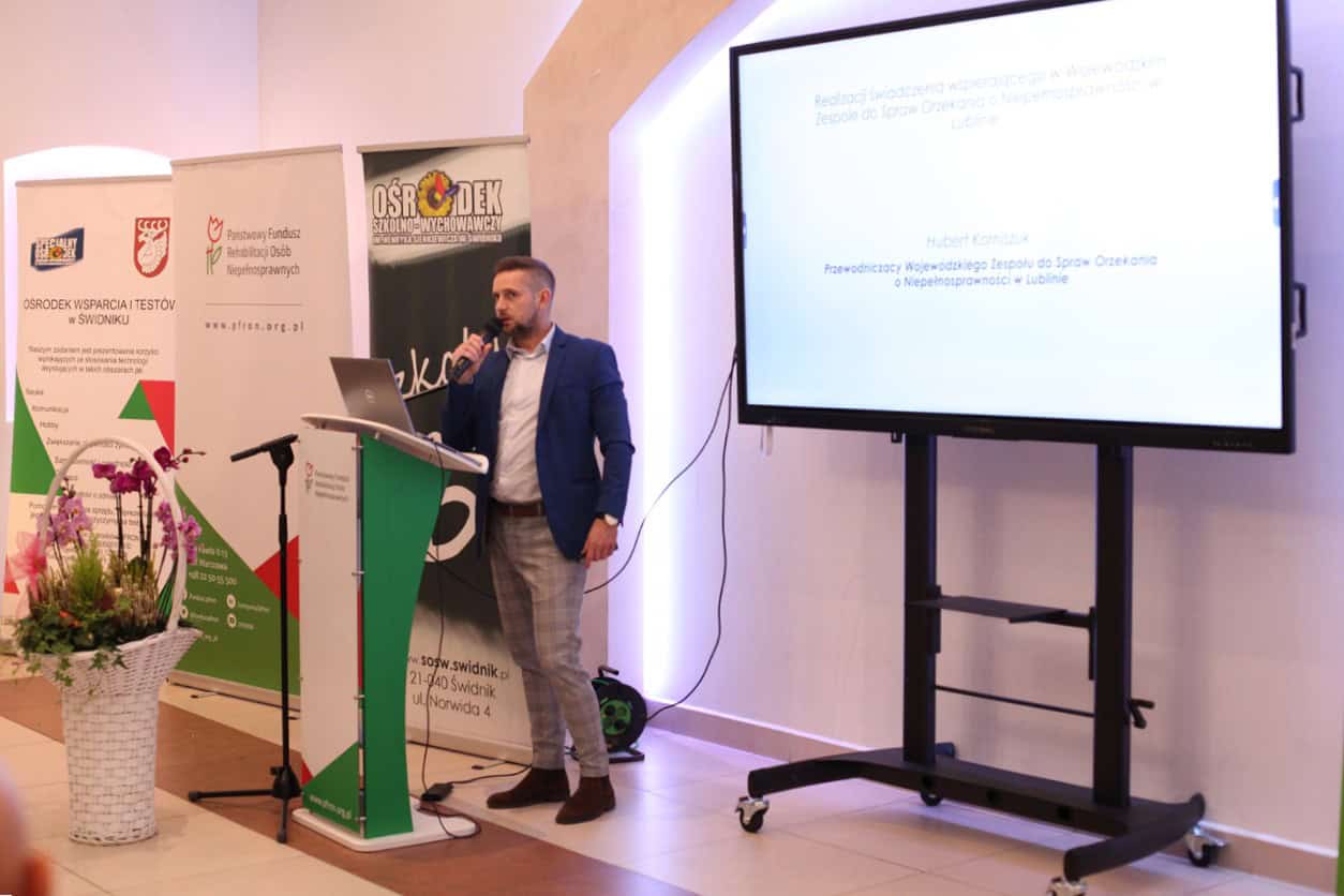 Tematykę prawną i socjalną przybliżył Hubert Korniszuk, Przewodniczący Wojewódzkiego Zespołu ds. Orzekania o Niepełnosprawności, w prelekcji „Orzecznictwo, świadczenia i wsparcie rehabilitacyjne”. Prelegent skupił się na niedawno wprowadzonej zmianie systemowej, jaką jest świadczenie wspierające. Szczegółowo omówił definicję tego świadczenia i przedstawił praktyczne informacje dotyczące sposobu składania wniosku. Uzupełnieniem wystąpienia były aktualne dane z województwa lubelskiego, obrazujące stan wprowadzania nowego rozwiązania w lokalnej praktyce.