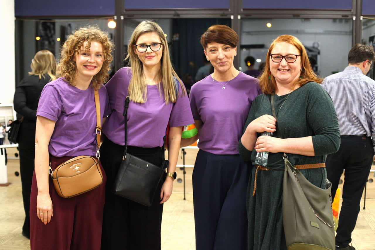 Cztery kobiety stoją obok siebie w sali. Trzy z nich mają na sobie fioletowe koszulki, a czwarta ciemnozieloną sukienkę. Kobiety pozują do wspólnego zdjęcia. Wszystkie są uśmiechnięte, patrzą wprost w obiektyw.