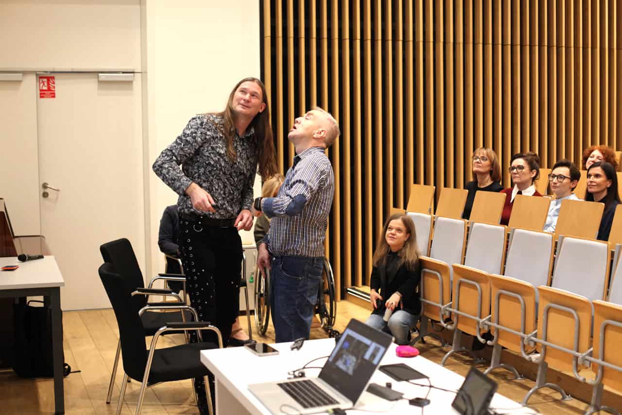 Scenę przejęli twórcy filmowi, a prywatnie przyjaciele: Maciej Książko, który jest też terapeutą oraz Piotr Kękuś. Ich obecność była natychmiastową lekcją synergii i głębokiego szacunku. W centrum ich twórczości, związanej ze Środowiskowym Domem Samopomocy Caritas w Krakowie, leży temat niepełnosprawności, ukazywany nie jako bariera, lecz jako unikalna perspektywa. Zajmują się dokumentacją różnych fragmentów życia, codzienności i historii. Ich projekty, regularnie nagradzane na festiwalach, są prawdziwe i surowe, bo czerpią z najgłębszej, ludzkiej więzi – przyjaźni, której początki to wspólne podróże, wyjazdy na koncerty i wspinaczka.