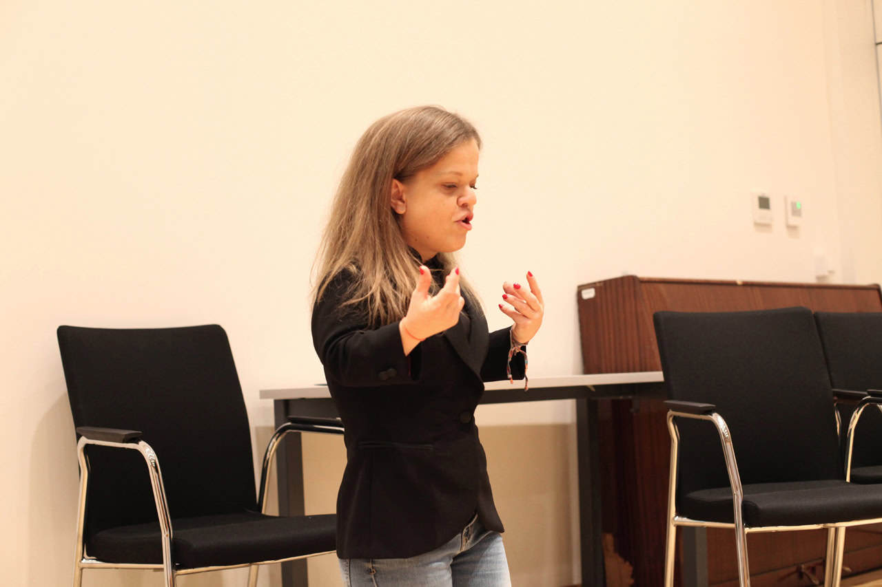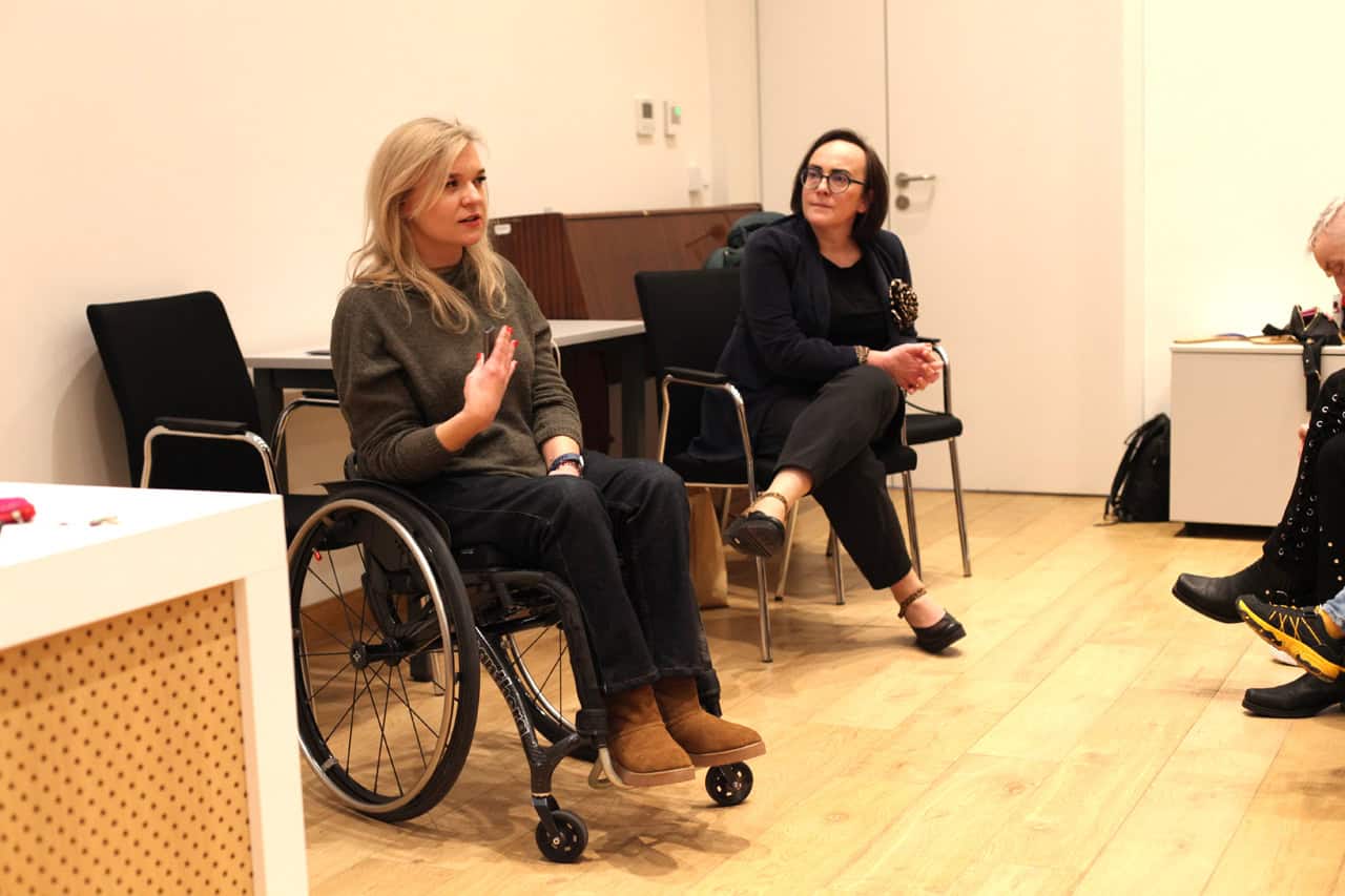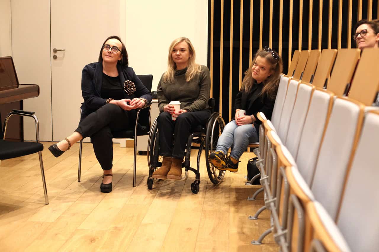 Panel dyskusyjny w sali wykładowej. Cztery osoby siedzą na krzesłach. Skrajnie po lewej, młoda kobieta na wózku (Angelika Chrapkiewicz-Gądek), ubrana w ciemnobrązowy sweter, trzyma mikrofon i przemawia. Obok niej siedzi kobieta w okularach i ciemnym żakiecie, wpatruje się w prelegentkę (Anna Bieganowska-Skóra). Obok z rękami skrzyżowanymi na kolanach siedzi mężczyzna z długimi włosami (Maciej Książko). Skrajnie po prawej, mężczyzna w koszuli w kratę siedzi z nogą założoną na nogę, zamyślony, z ręką na podbródku (Piotr Kękuś)