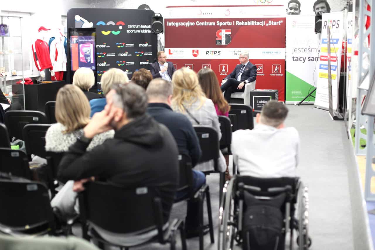 Dwóch elegancko ubranych mężczyzn (po prawej prof. Robert Litwiński) siedzi w fotelach podczas panelu dyskusyjnego. Rozmawiają przed dużym czerwono-czarnym banerem promującym „Integracyjne Centrum Sportu i Rehabilitacji 'Start'" z logotypami Lublina. Widok z widowni