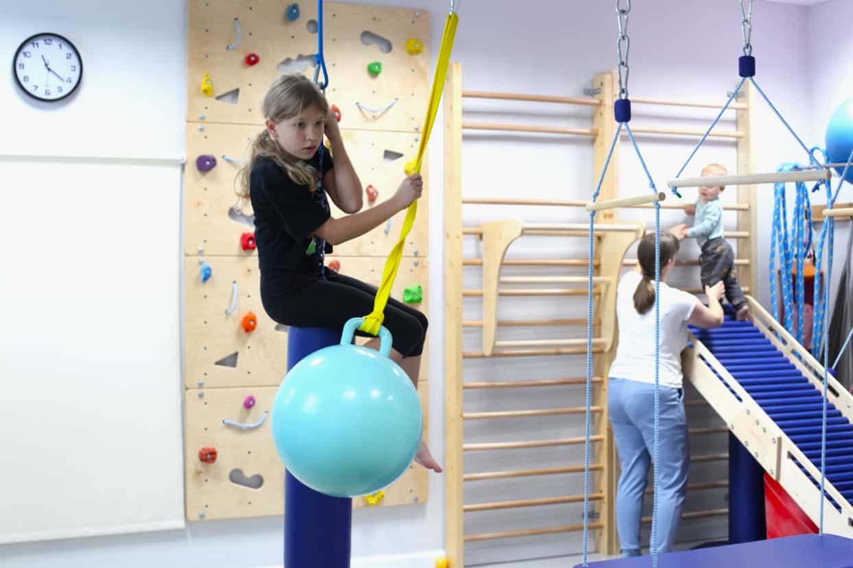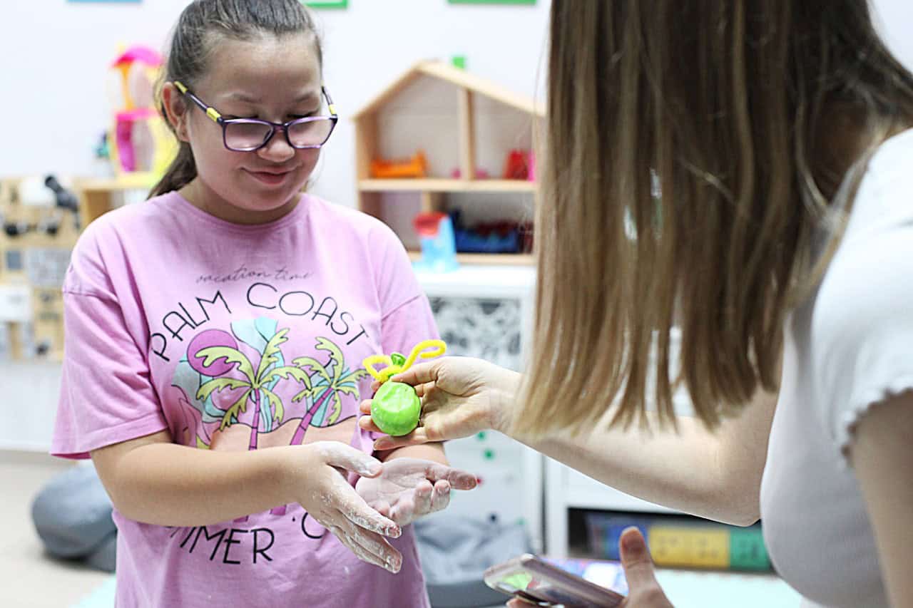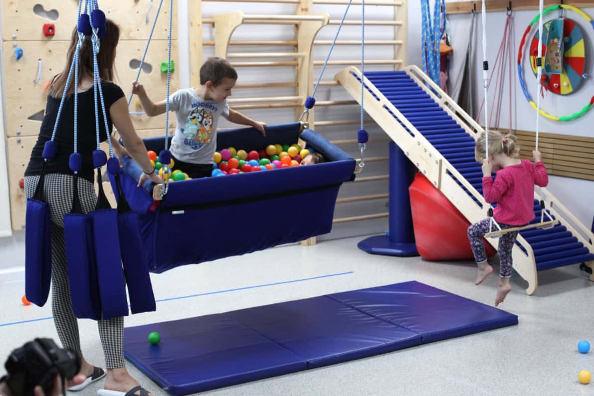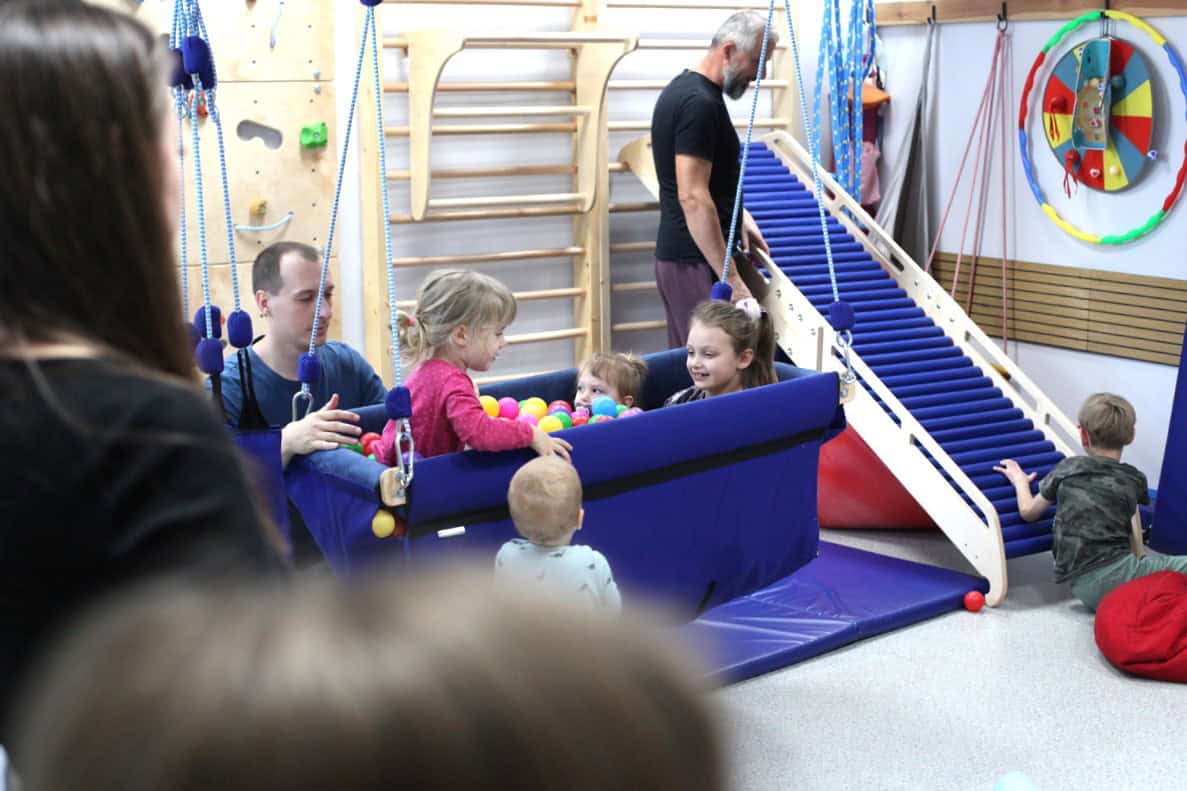 W strefie sensoplastyki dzieci z zapałem dotykały, ugniatały, mieszały i tworzyły małe dzieła sztuki, nie przejmując się ani trochę kolorowymi plamami. Równie dużą energię można było zobaczyć w gabinecie integracji sensorycznej. W doskonale zaopatrzonej sali terapeutycznej maluchy dosłownie fruwały! Zjeżdżały na drewnianej zjeżdżalni, wspinały się na ściance wspinaczkowej i ćwiczyły, doskonale się przy tym bawiąc.