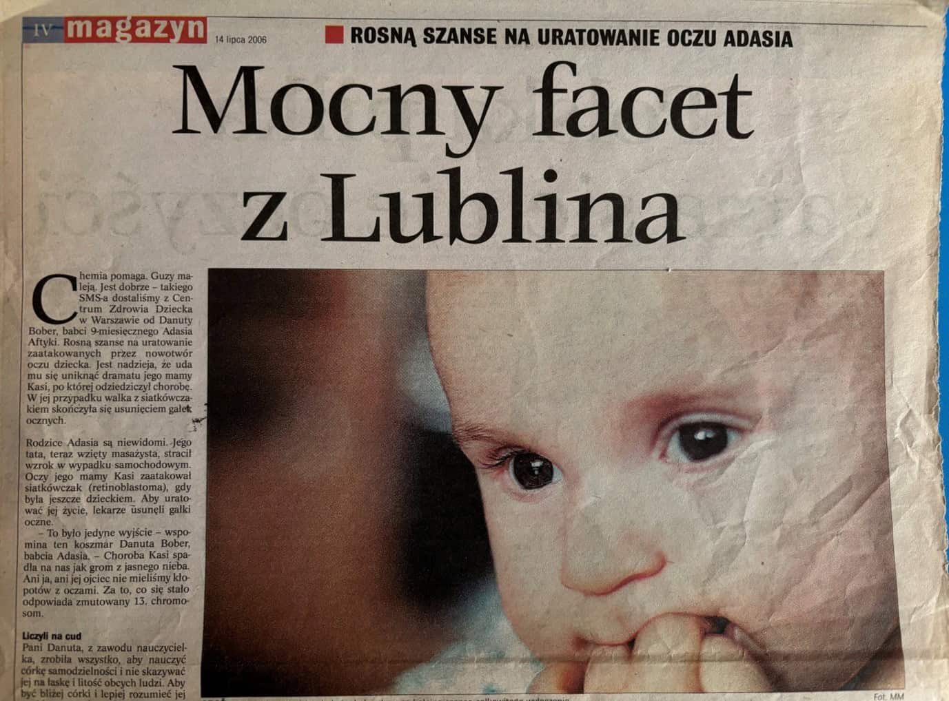 Rodzice Adasia, oboje niewidomi, pomimo opinii lekarskich, podjęli decyzję o urodzeniu dziecka, bo „liczyli na cud”, jak powiedział ojciec chłopca, zapytany przez lubelską dziennikarkę, dlaczego zdecydowali się na takie ryzyko, wiedząc, że dziecko może być obarczone okrutną chorobą (artykuł pt. „Mocny facet z Lublina”, zamieszczony w Magazynie nr 4 z dnia 14 lipca 2006 r.)