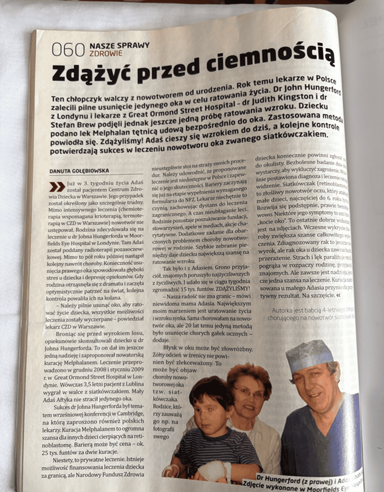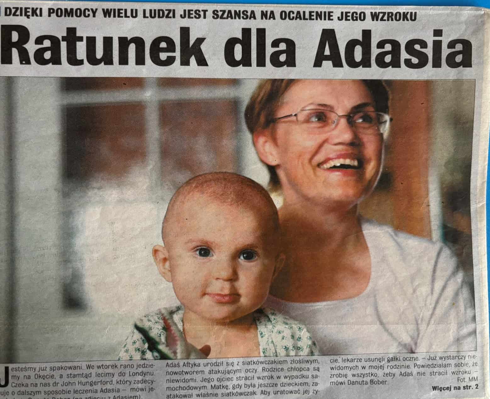 Babcia chłopca słysząc o propozycji usunięcia oka Adasia postanowiła szukać ratunku poza granicami Polski. I tak Adaś trafił do Anglii, gdzie w londyńskiej klinice Moorfields Eye Hospital u dr Johna Hungerforda kontynuował leczenie.