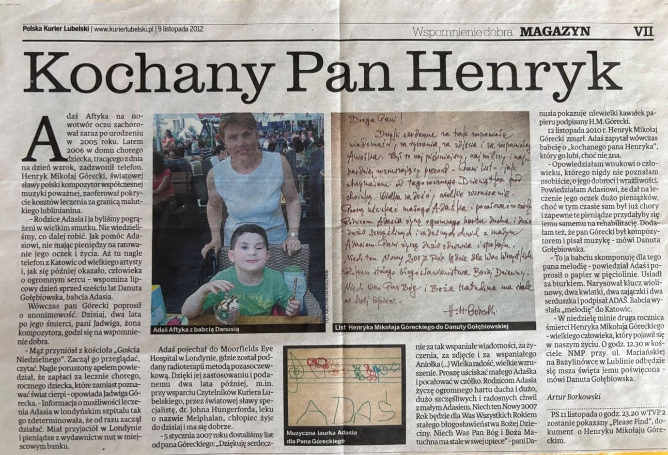 Serdeczne prośby o pomoc publikowane były różnych mediach, ale ta w „Gościu Niedzielnym” z dnia 2 lipca 2006 r, „Mamy mało czasu, by uratować Adasia” zaowocowała wsparciem leczenia chłopca w Londynie przez kompozytora Henryka Góreckiego. Cud? Pan Górecki prosił o anonimowość i dlatego artykuł pt. „Kochany Pan Henryk” ukazał się dopiero po śmierci kompozytora za zgodą jego żony. Śp. redaktor Artur Borkowski w VII Magazynie Kuriera Lubelskiego z 9 listopada 2012 r. w drugą rocznicę śmierci kompozytora III Symfonii opatrzył go mianem „Wspomnienie dobra”.