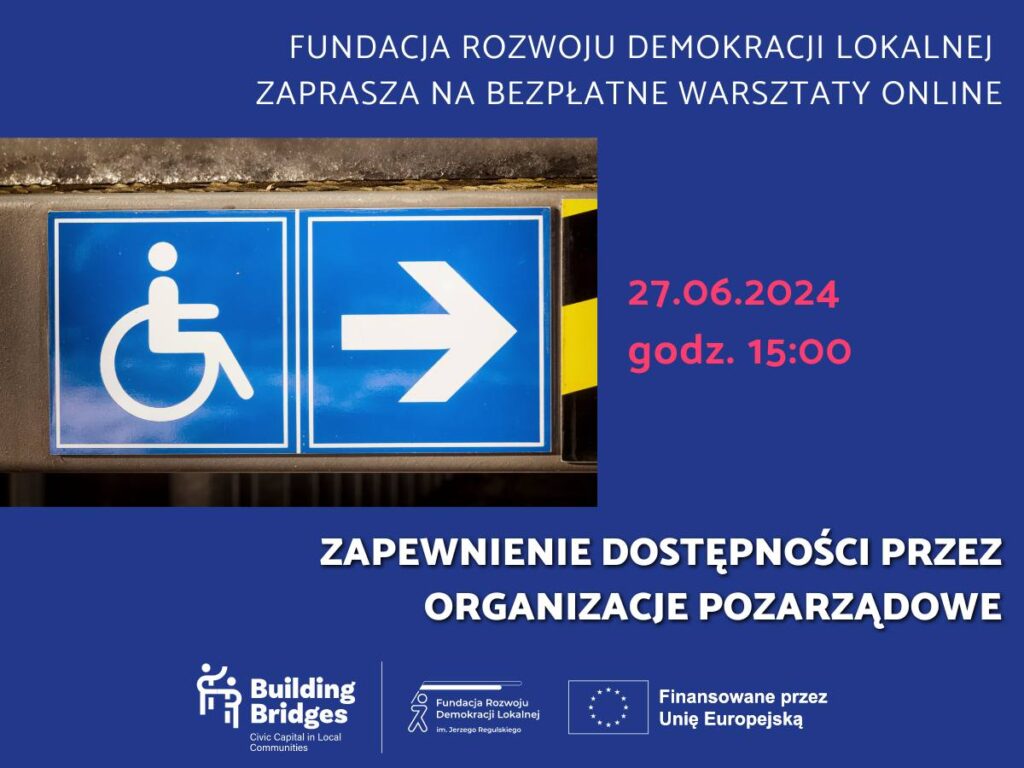 Fundacja Rozwoju Demokracji Lokalnej im. Jerzego Regulskiego zaprasza do udziału w warsztacie pt. "Zapewnienie DOSTĘPNOŚCI przez organizacje pozarządowe - jak zrealizować ustawowy obowiązek?", który odbędzie się w najbliższy czwartek 27 czerwca w godz. 15:00-19:00.