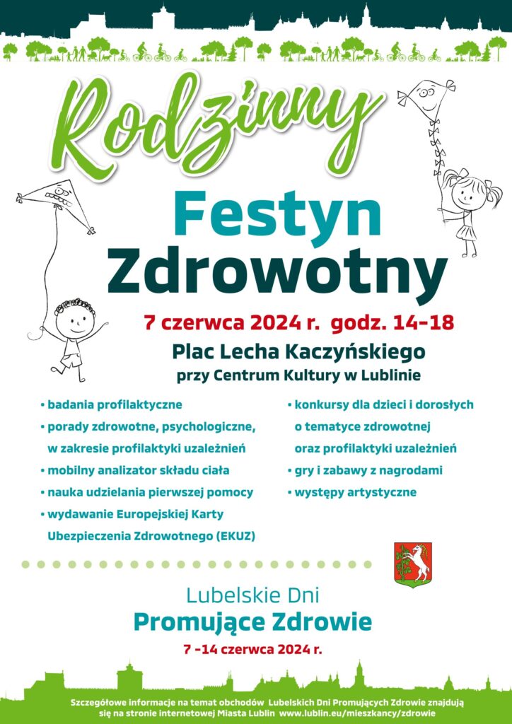 Lubelskie Dni Promujące Zdrowie zainauguruje Rodzinny Festyn Zdrowotny z licznymi atrakcjami dla dzieci i dorosłych, który odbędzie się w piątek (7 czerwca), o godz. 14:00 na Placu im. Lecha Kaczyńskiego. Podczas wydarzenia przewidziano wiele atrakcji, m.in. występy artystyczne, liczne konkursy dla dzieci i dorosłych o tematyce zdrowotnej, a także gry i zabawy z nagrodami.